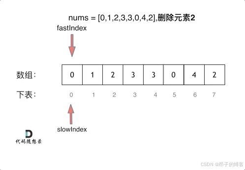 - 快指针:寻找新数组的元素 ,新数组就是不含有目标元素的数组