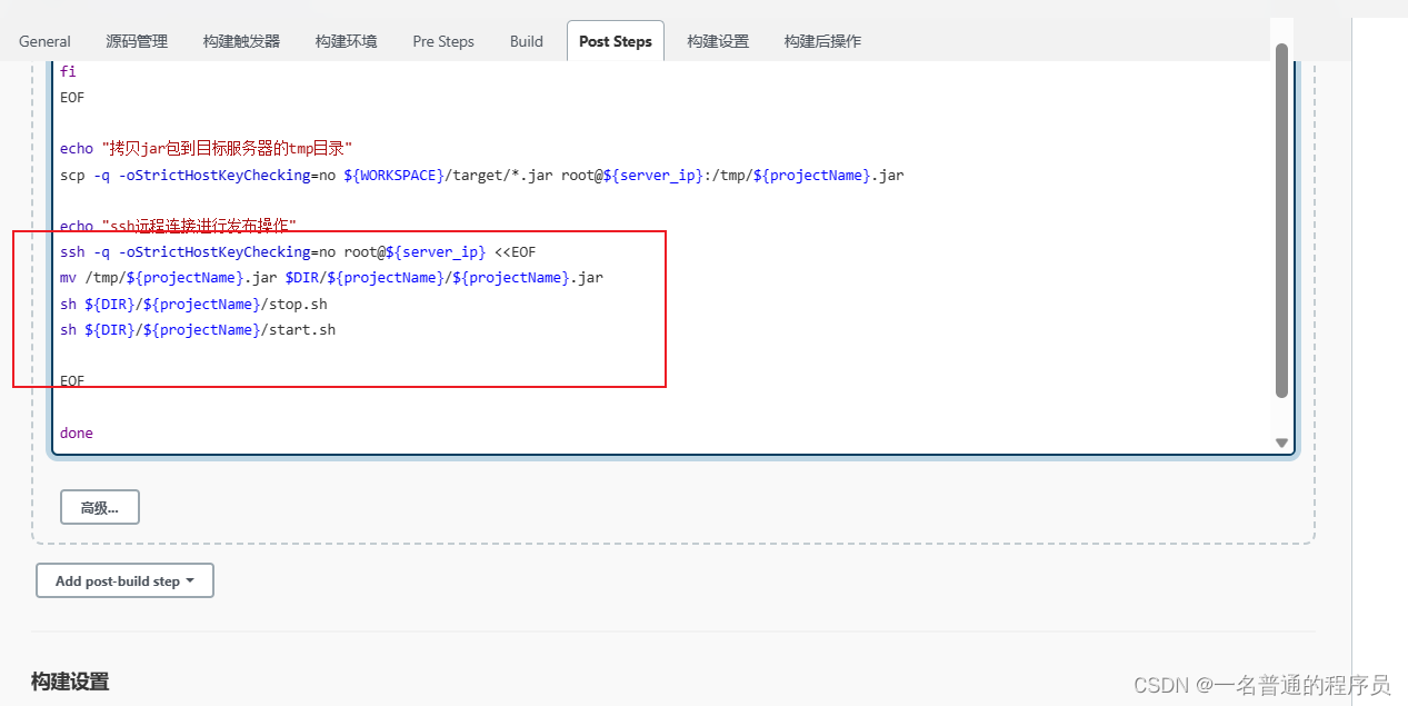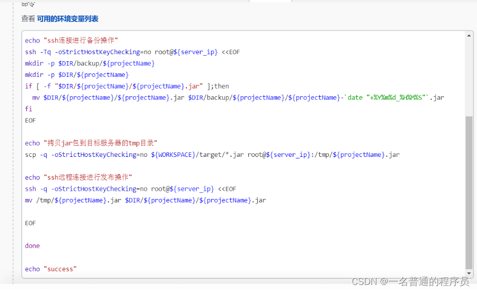 scp -q -oStrictHostKeyChecking=no ${WORKSPACE}/target/*.jar root@${server_ip}:/tmp/${projectName}.jarecho "ssh远程连接进行发布操作"