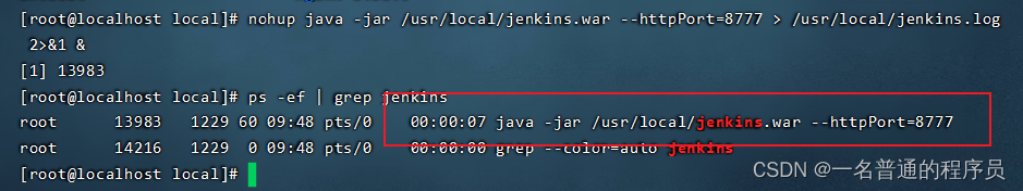 nohup java -jar /usr/local/jenkins.war --httpPort=8777 > /usr/local/jenkins.log 2>&1 &