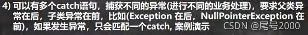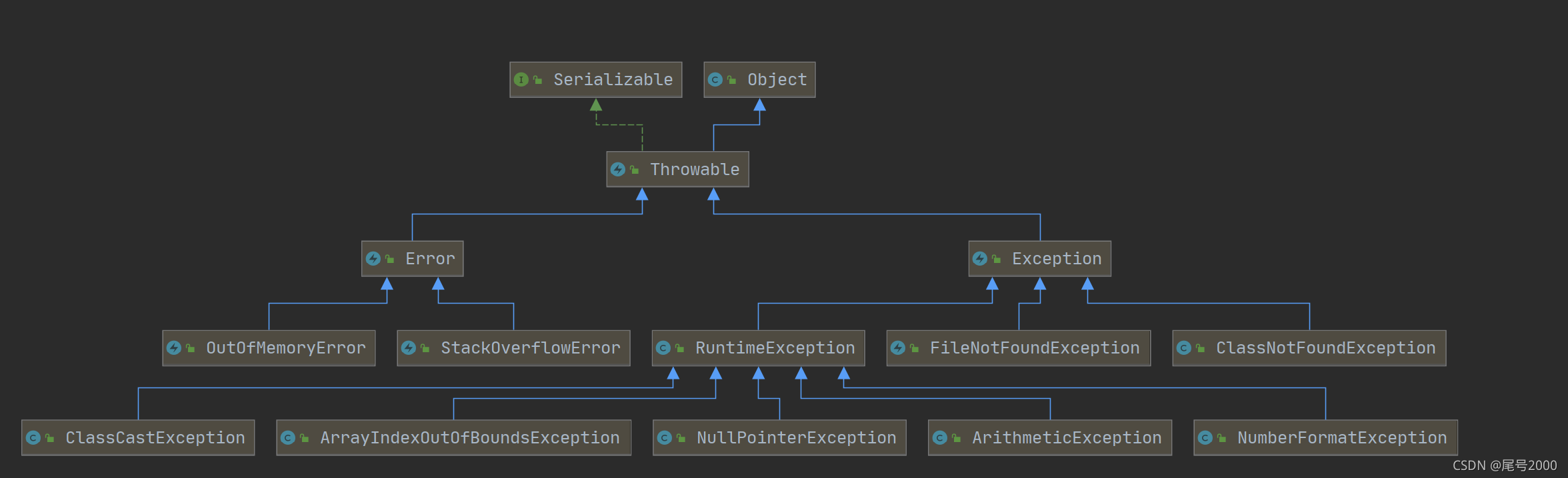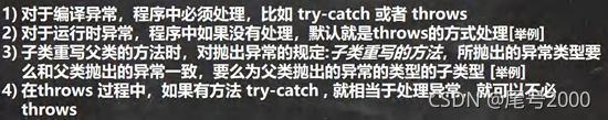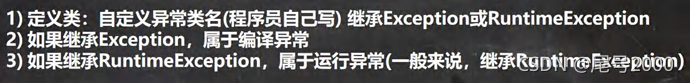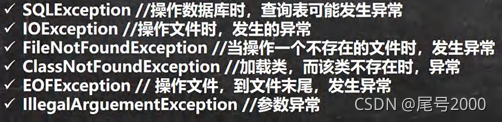 (2)Exception:其他因编程错误或偶然的外在因素导致的一般性问题,Exception分为两类:(1)运行时异常(编辑器检查不出来)(2)编译时异常(编译时编辑检查出的异常)