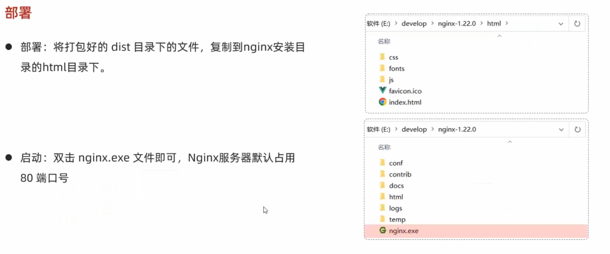 注意:Nginx默认占用80端口号,如果80端口号被占用,可以在nginx.conf中修改端口号(netstat-ano|findStr 80)
