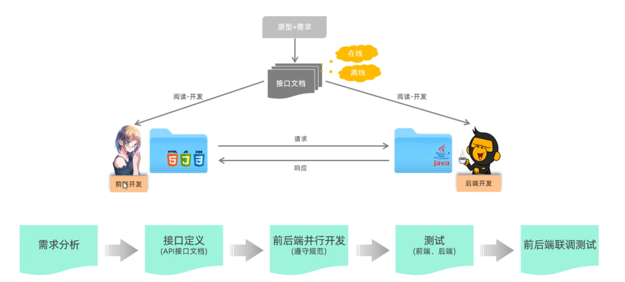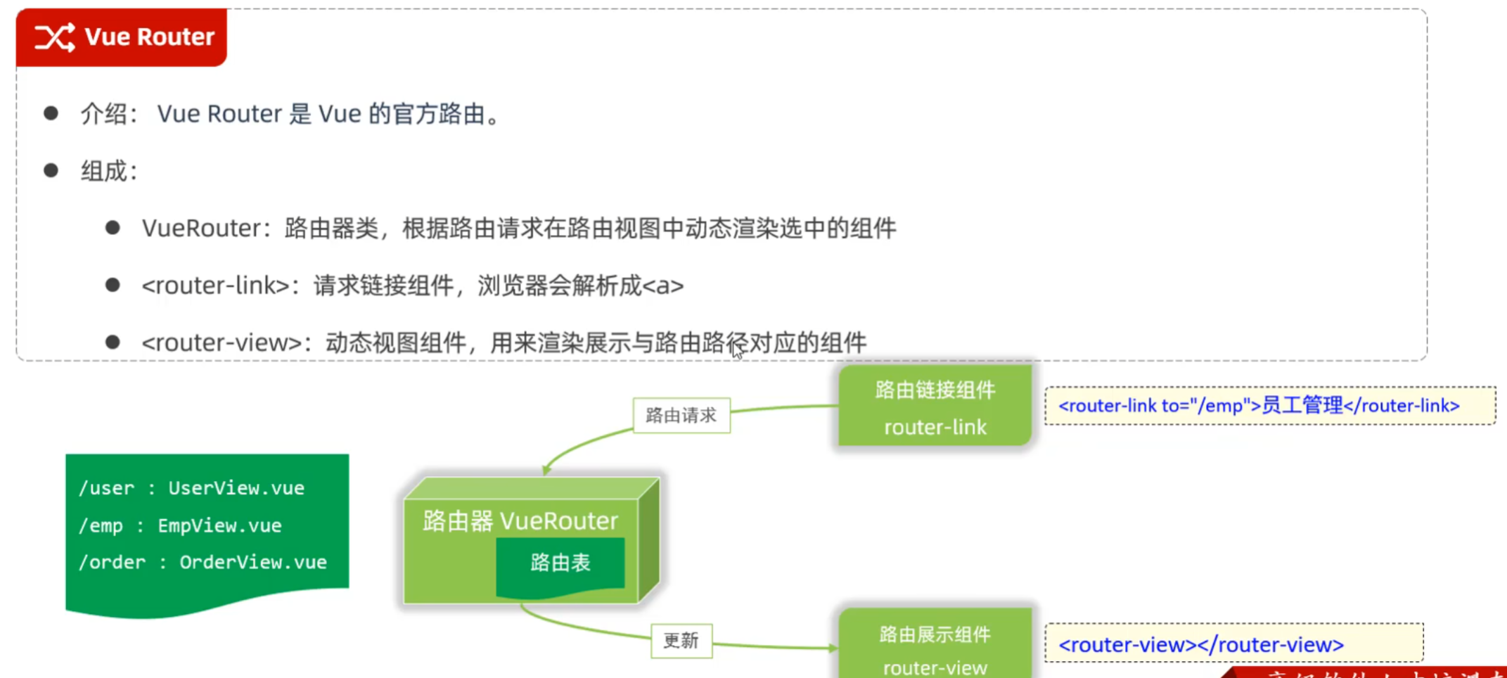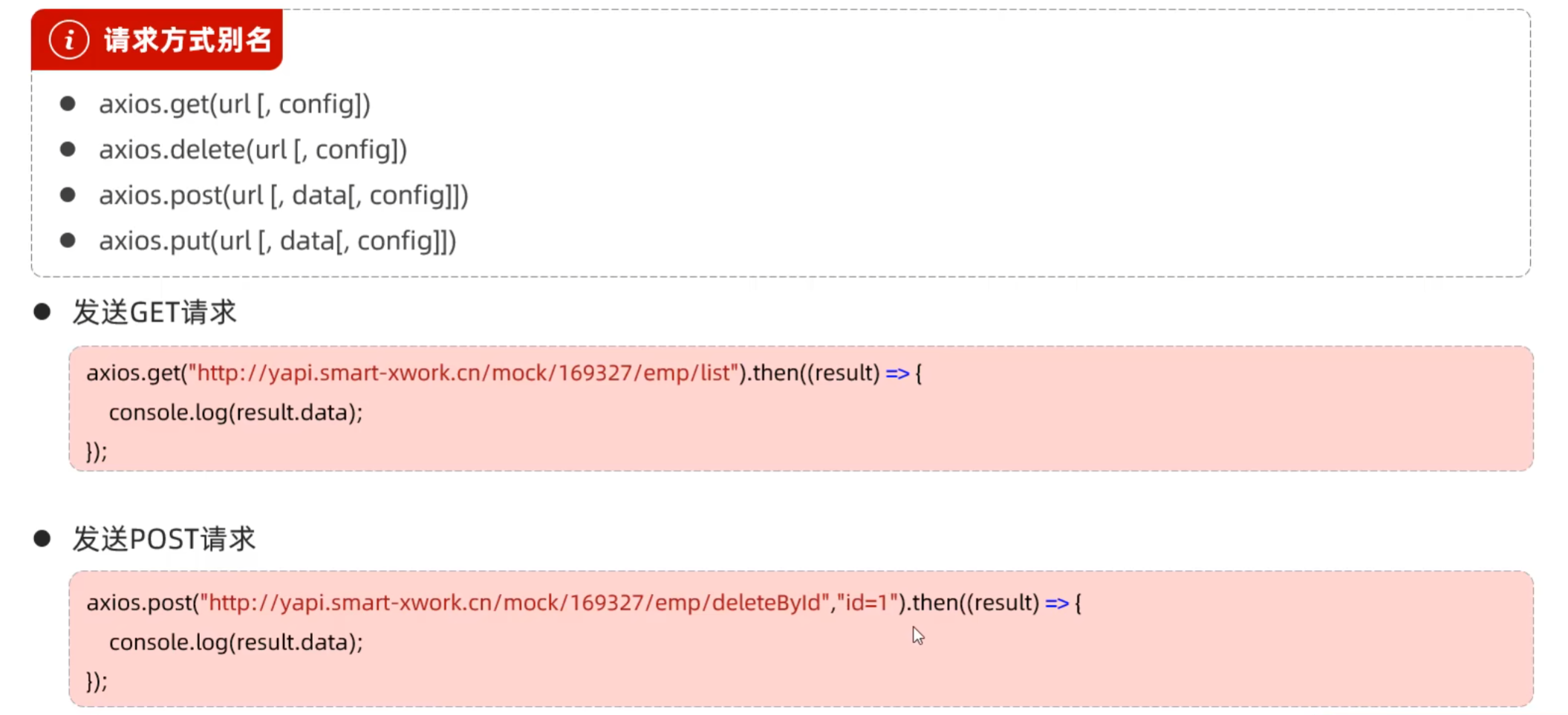 - 数据交换:通过Ajax可以在前端html页面中动态的给服务器发送Ajax请求,并获取服务器响应的数据,html获取到服务器端响应回来的数据之后,就可以基于Vue当中的指令来进行数据的渲染展示。