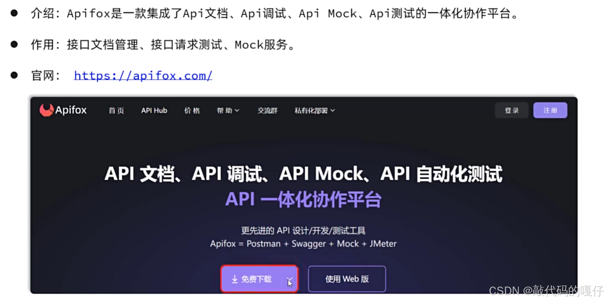 这里可以使用Apifox来解决这个问题,因为浏览器地址栏发起的请求,都是GET方式的请求,如果我们需要POST、PUT、DELETE方式的请求,就需要借助这类工具。