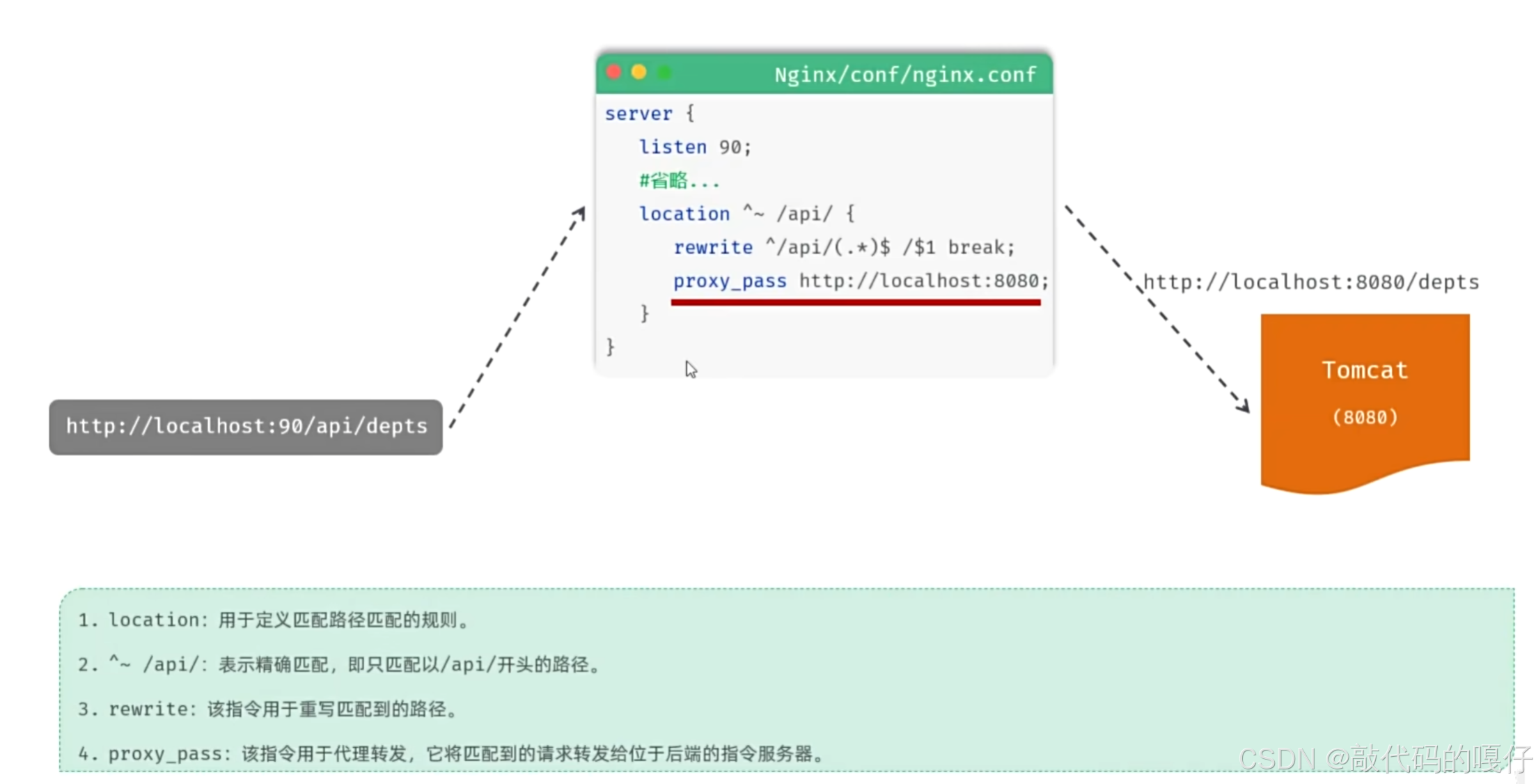 执行 proxy_pass:把修改后的请求 http://localhost:8080/depts 转发给 Tomcat;