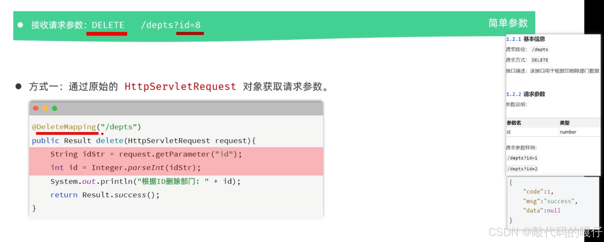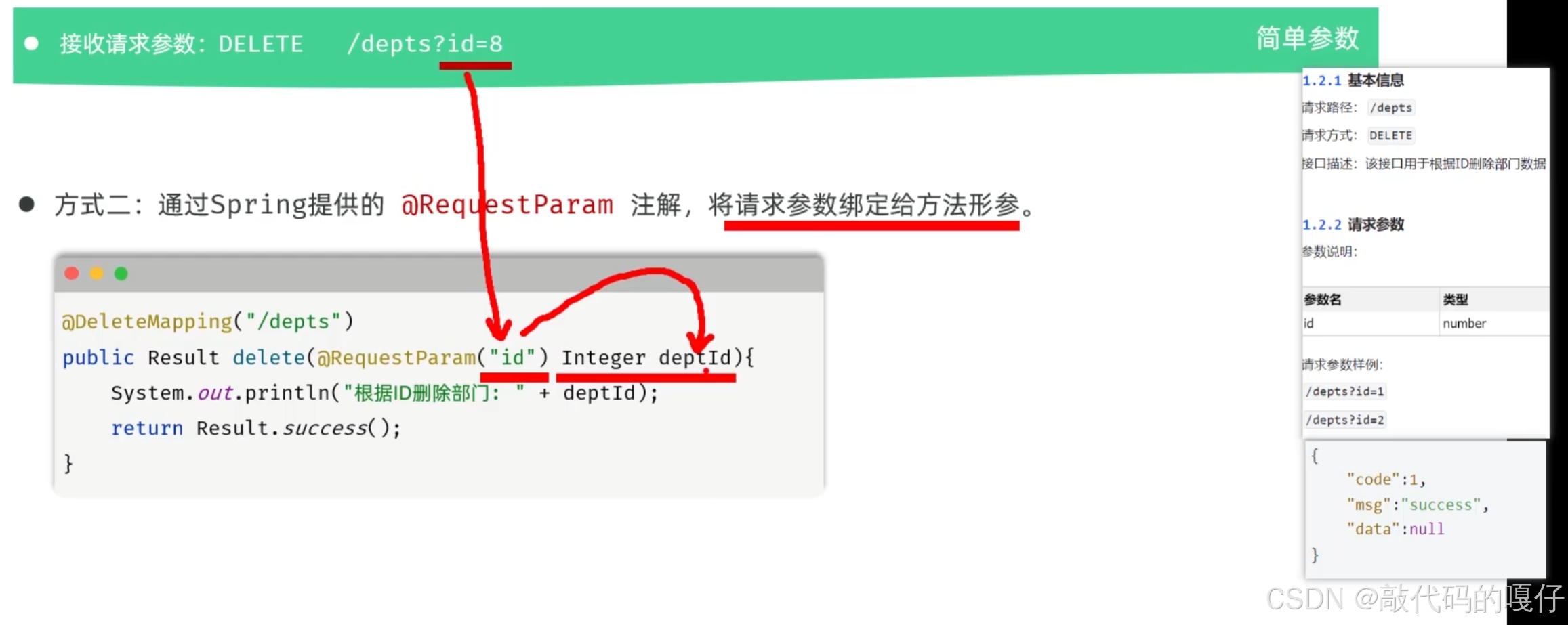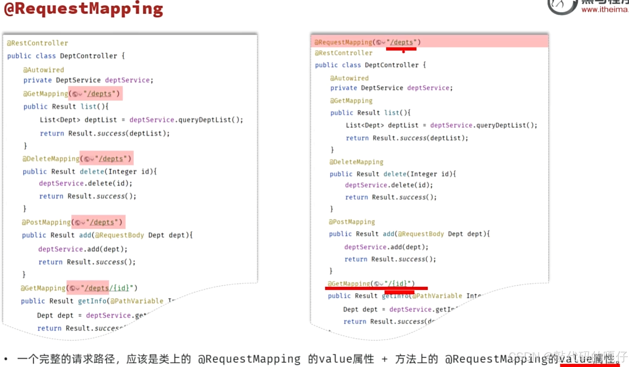 注:@RequestMapping("/depts") 加在Controller 类上时,作用是为当前类中所有接口方法统一指定请求路径的前缀。