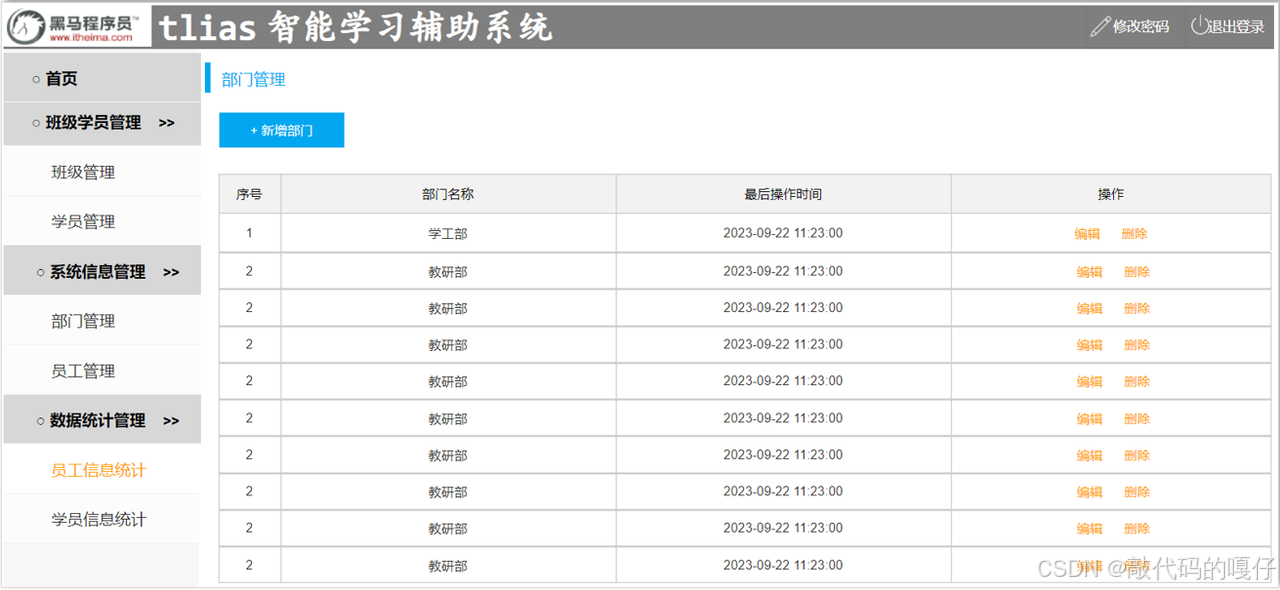 - 操作日志:记录员工的系统操作(如新增部门、修改员工信息等)