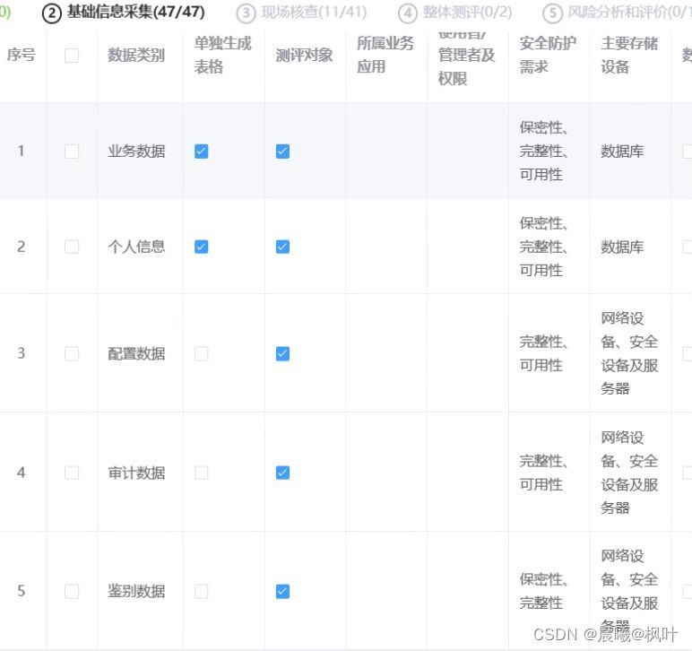 | (5)个人信息 | 应用系统、数据库(现场核查+访谈是否涉及个人信息) | 保密性、完整性、可用性 |
