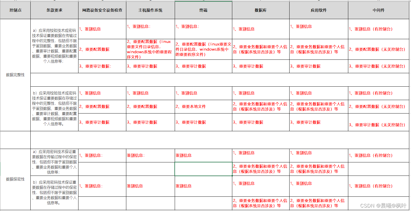 | (1)鉴别数据 | 网络设备、安全设备、服务器、数据库、应用系统、中间件等 | 保密性、完整性 |