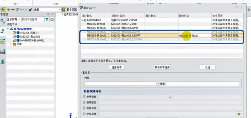 2. 为新建的零件文件改名。双击复制【旧名称】从而快速生成新名称,工程图名称相应改变。