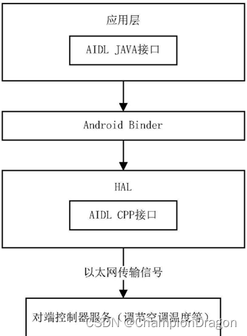 3.binder模块,应用层实现java接口作为上层的client,hal层实现cpp接口作为底层server,应用层和hal层间通过binder模块以binder模式进行通信。通过上述技术方案,方便了当hal层向应用层的发送某些功能,加强了应用层与hal层之间的联系,所述binder模式通过binder driver实现,所述应用层获取hal层的一个接口作为代理接口;应用层调用代理接口并生成请求数据,发送给binder driver;hal层通过binder模块读取binder driver中的请求数据,处理并将结果返回。通过binder driver使hal层既可以读取应用层发出的请求,也可以将处理结果返回,方便了应用层和hal层之间的双向通信。在应用层中定义aidl接口并获取aidl接口文件的步骤之后包括:定义所述aidl接口文件版本号,hal层支持所有版本的服务接口。