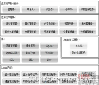 应用框架层:java/C/C++代码 Framework API+JNI方法 服务端、客户端、Linux驱动。