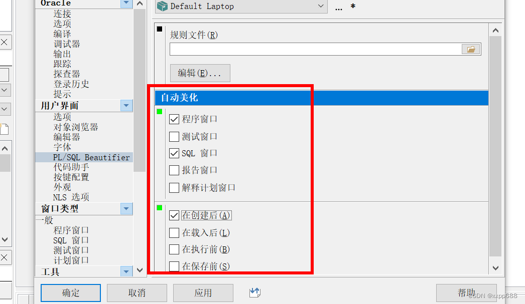 用户界面 --> pl/sql bea... --> 自动美化 ---> 勾选sql窗口 ---> (可以选择在保存后美化)