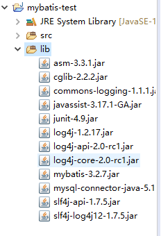 1、首先,使用eclipse新建一个java工程,在lib目录下加入mybatis核心包、依赖包、数据驱动包,然后BuildPath一下。