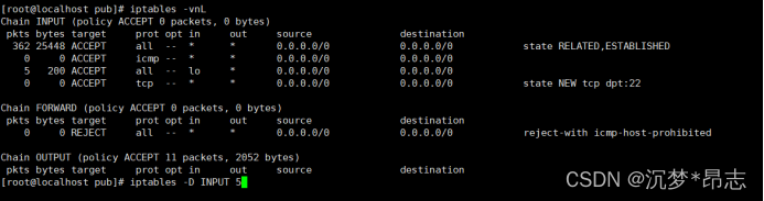 iptables -D INPUT 5 ##删除规则,通过表内行号删除