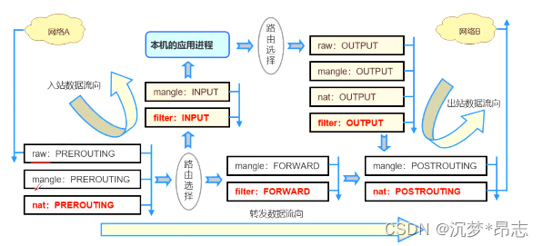 出站数据流向:防火墙本机向外部地址发送的数据包(如在防火墙主机中测试公网DNS服务时),首先进行路由选择,确定了输出路径后,再经由 OUTPUT链处理,最后再交POSTROUTING链(是否修改数据包的地址等)进行处理。