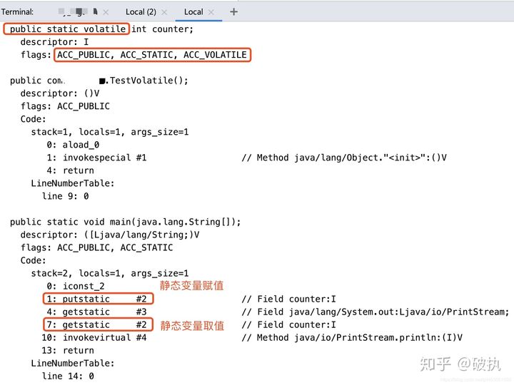 通过javac TestVolatile.java将类编译为class文件,再通过javap -v TestVolatile.class命令反编译查看字节码文件。