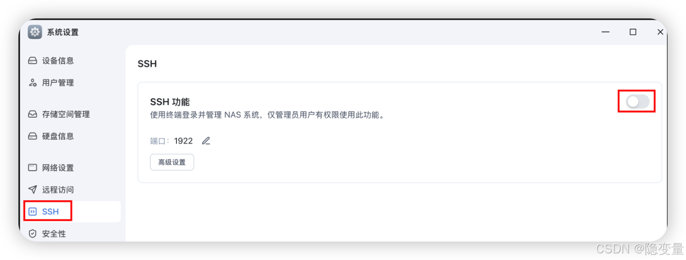 - 勾选 启用 SSH 服务,默认端口为 22,建议修改冷门端口