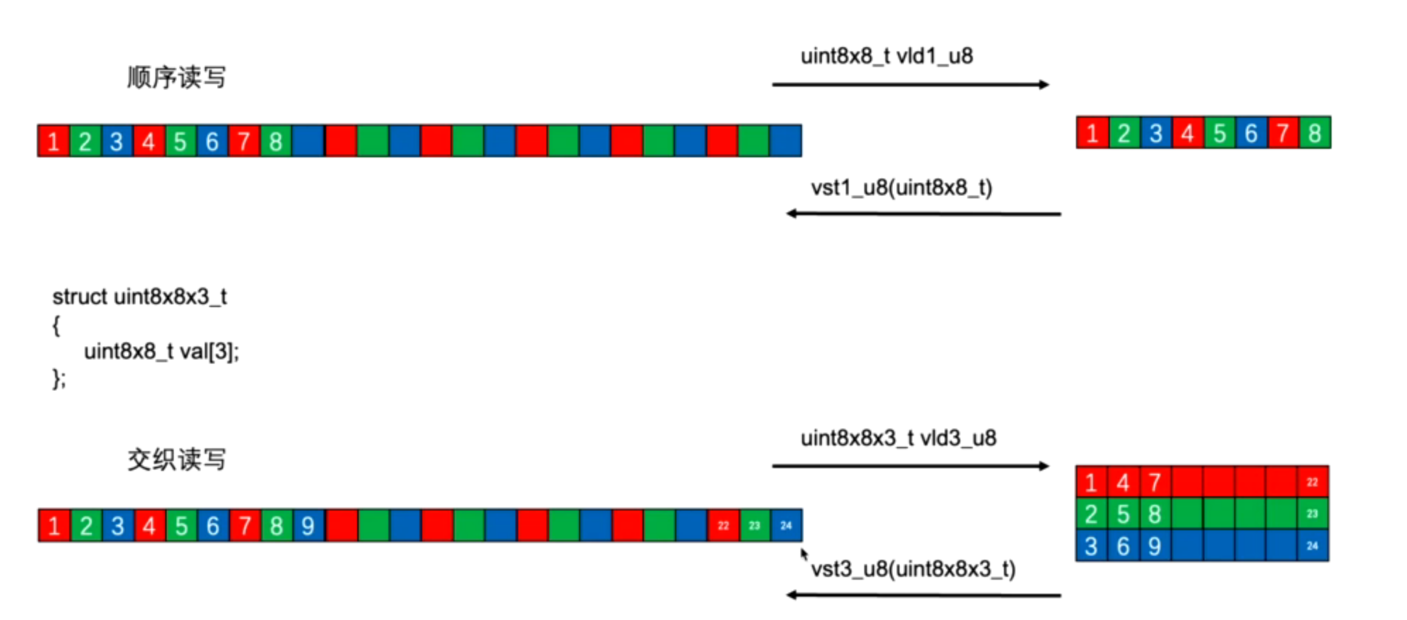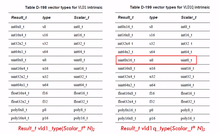 - NEON 还提供了数组向量数据类型,命名模式如下:<type><size>x<number of lanes>x<length of array>_t,eg:int8x16x4_t 是一个长度为 4 的数组,每一个数据的类型为 int8x16_t