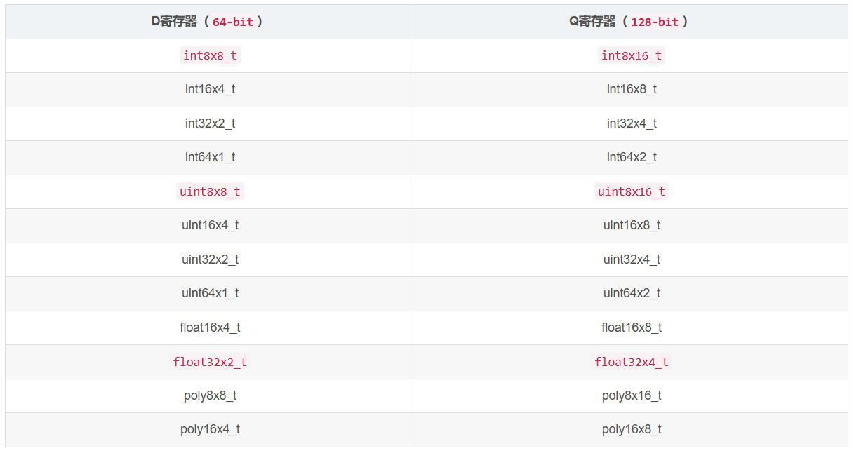 - NEON 向量数据类型是根据以下模式命名的:<type><size>x<number_of_lanes>_t,eg:int8x16_t 是一个16 通道 的向量,每个通道包含一个有符号 8 位整数