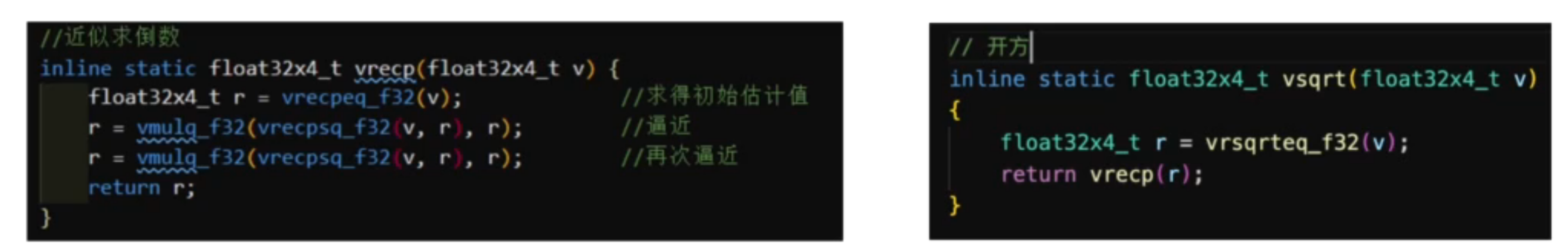 - NEON 内嵌函数:类似于普通函数调用,简单易维护,编译器负责将 NEON 指令替换成汇编语言的复杂任务,主要包括寄存器分配和代码调度以及指令集重排,来达到获取最高性能的目标