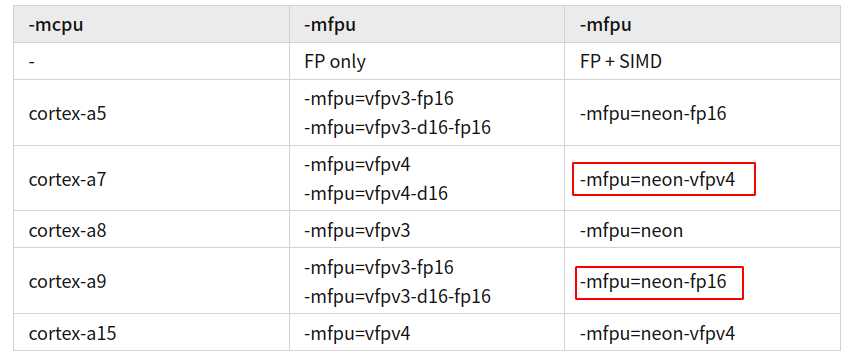 -mcpu的情况下,编译器将使用默认配置(取决于编译工具链时的选项设置)进行编译,通常情况下-mfpu和-mcpu的配置存在关联性,对应关系如下: