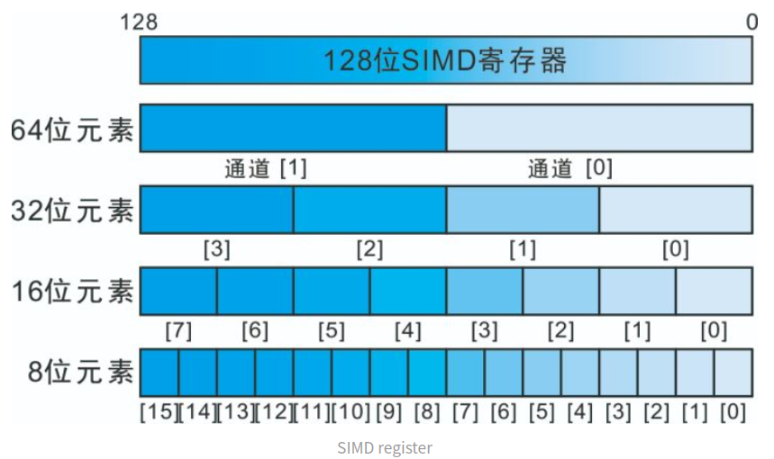 - 新的 Armv8a 架构有 32 个 128bit 向量寄存器,老的 ArmV7a 架构有 32 个 64bit(可当作 16 个128bit)向量寄存器,被用来存放向量数据,每个向量元素的类型必须相同,根据处理元素的大小可以划分为 2/4/8/16 个通道