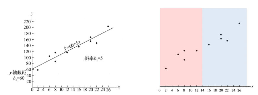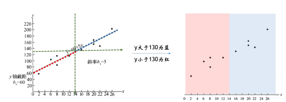 如上图所示把线性回归(左)根据y值的大小分为两类(右)。