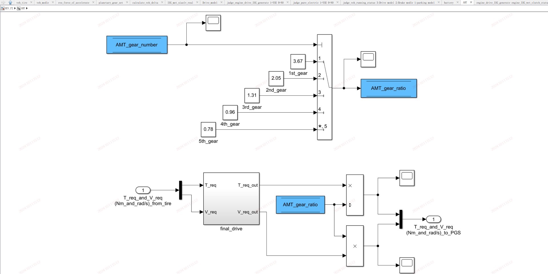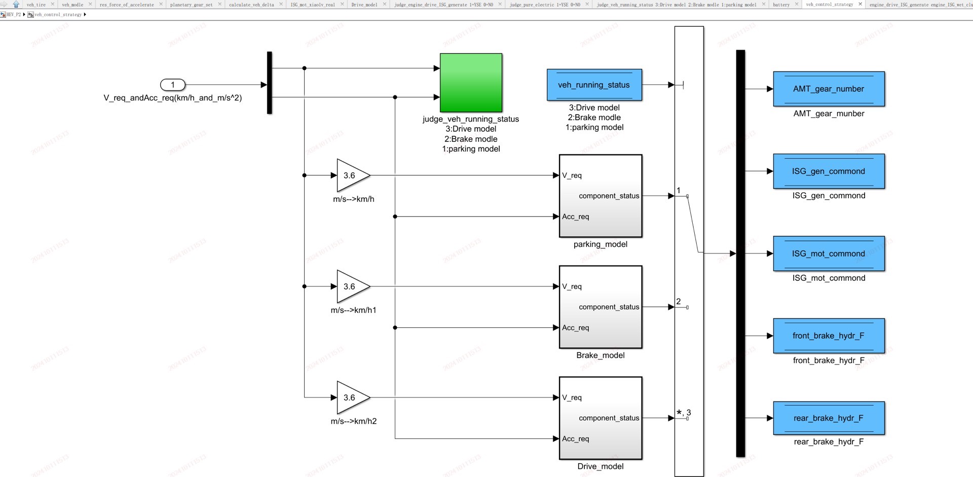 ③整车similink模型中包含工况输入模型、驾驶员模型、发动机模型、电机模型、制动能量回收模型、转矩分配模型、运行模式切换模型、档位切换模型纵向动力学模型;