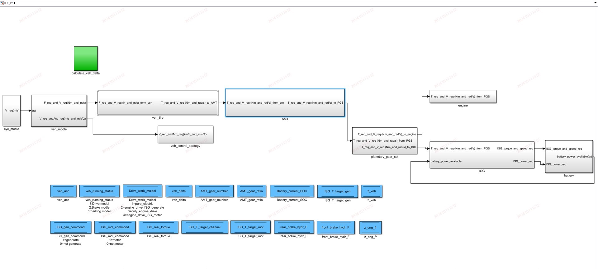 - 模型结构:我们的模型包含了工况输入模型、驾驶员模型、发动机模型、电机模型、电池模型等关键模块。这些模块共同构成了完整的P2混合动力汽车并联仿真模型。
