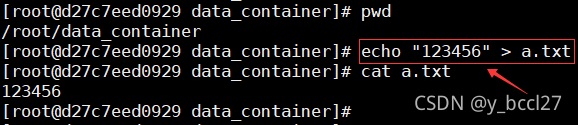 接着会发现在宿主机中的/root/data目录下的a.txt文件中也会多了这么一段内容: