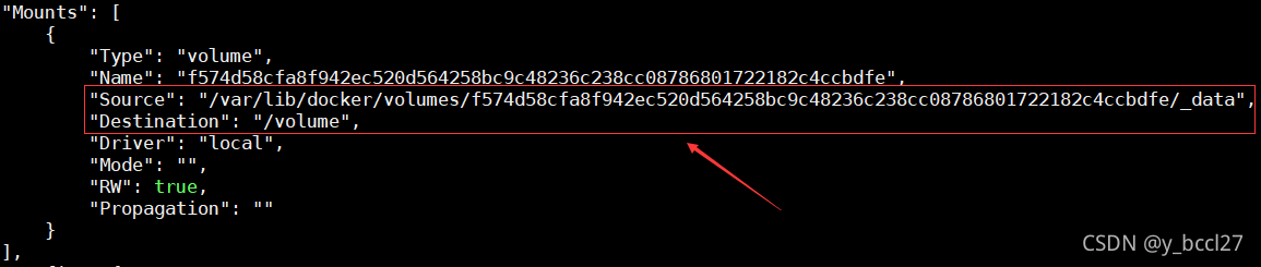 接着再开启一个终端,使用docker inspect c3命令查看容器的挂载情况,可以看到docker已自动在宿主机上分配了一个挂载目录: