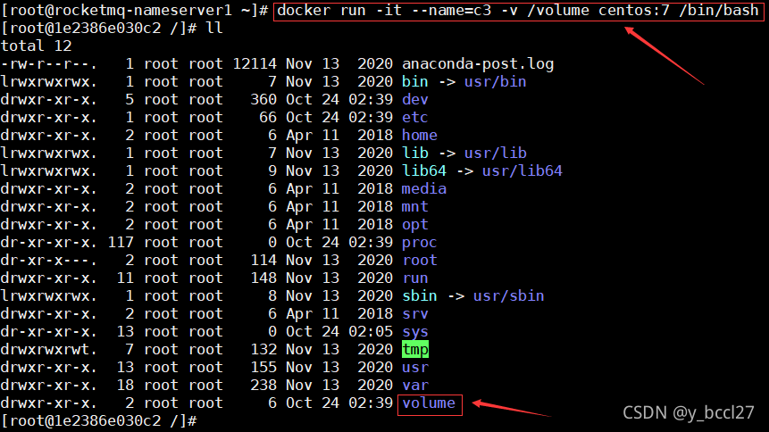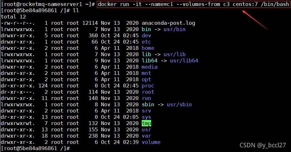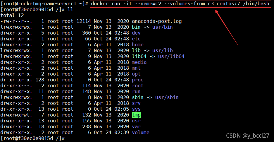 docker run -it --name=c2 --volumes-from c3 centos:7 /bin/bash