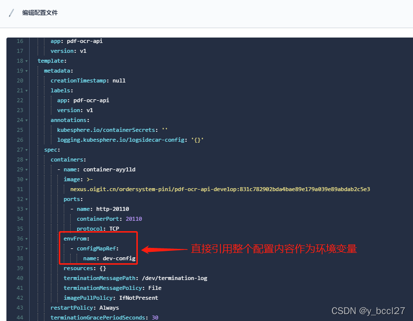 通过KubeSphere进入到相应服务的配置文件的编辑界面,追加envFrom配置部分