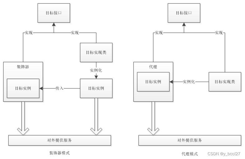 1、代理是全权代理,目标根本不对外,全部由代理类来完成;装饰是增强,是辅助,目标仍然可以自行对外提供服务,装饰器只起增强作用。