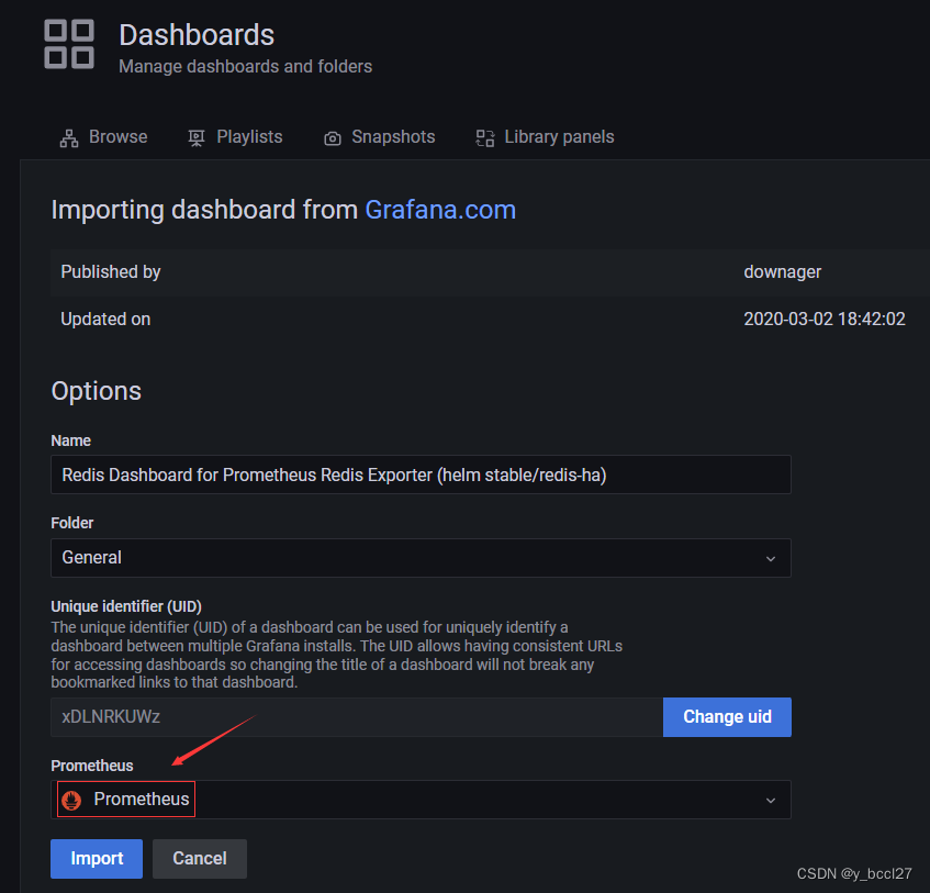 接着还需要指定该模板所对应的数据源,此处选择前面创建好的普罗米修斯数据源,最后点击“Import”,如下所示: