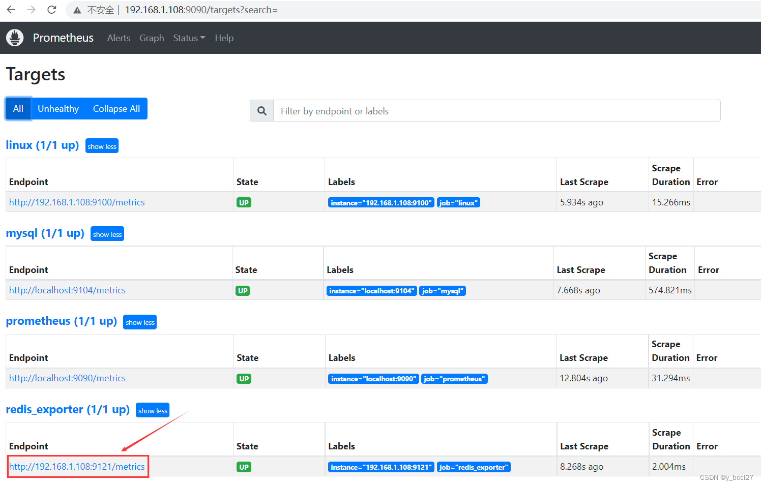 访问 http://192.168.1.108:9090/ 在prometheus上进行查看: