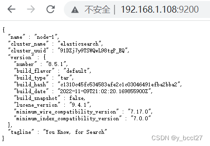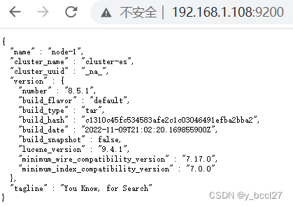 我们在浏览器中再次访问192.168.1.108:9200, 其页面返回内容如下,出现了这个则说明Elasticsearch单节点部署成功