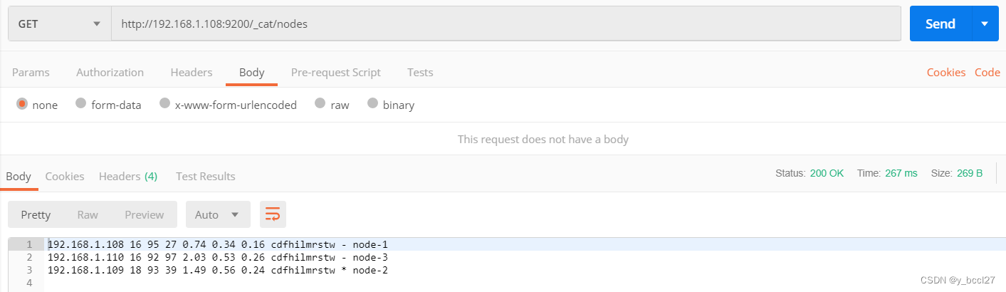 当上述两个集群节点服务启动了以后,在Postman中GET请求访问下述接口查看当前集群信息: