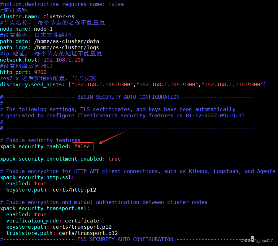 重点需要关注的是下面这行配置,两个集群节点中一定要加上这个,因为暂时还不知道xpack.security的作用,其它相关联的参数还不知道怎么配置,因此先屏蔽掉这部分配置: