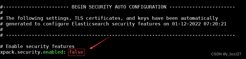 那么这个时候我们需要将elasticsearch.yml文件中自动添加(Elasticsearch服务首次启动以后就会产生)的安全配置区域中的 xpack.security.enabled 配置项设置为false。
