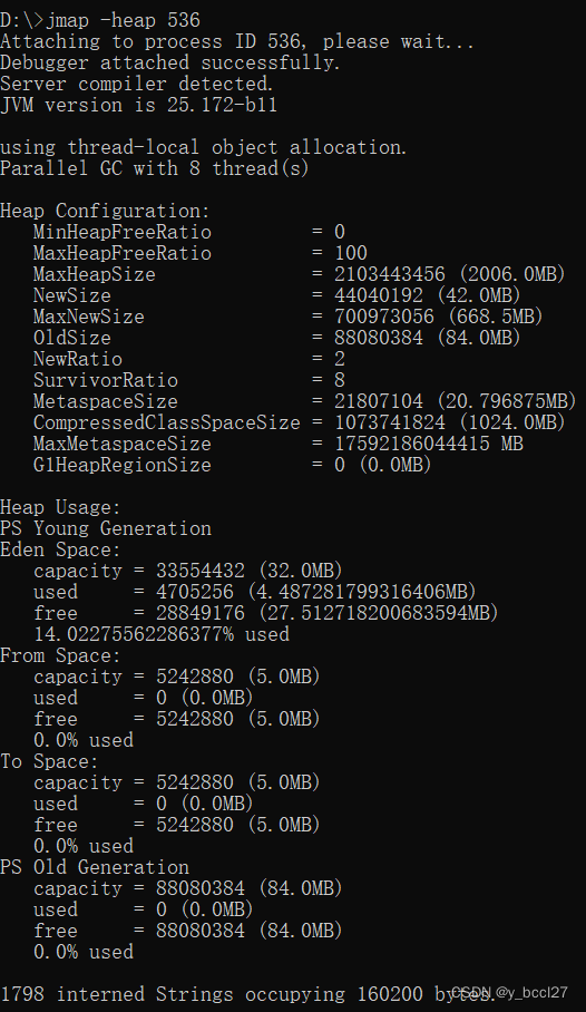 通过该命令可以看到Java堆和永久代的详细信息、空间使用率、当前用的是哪种收集器等。