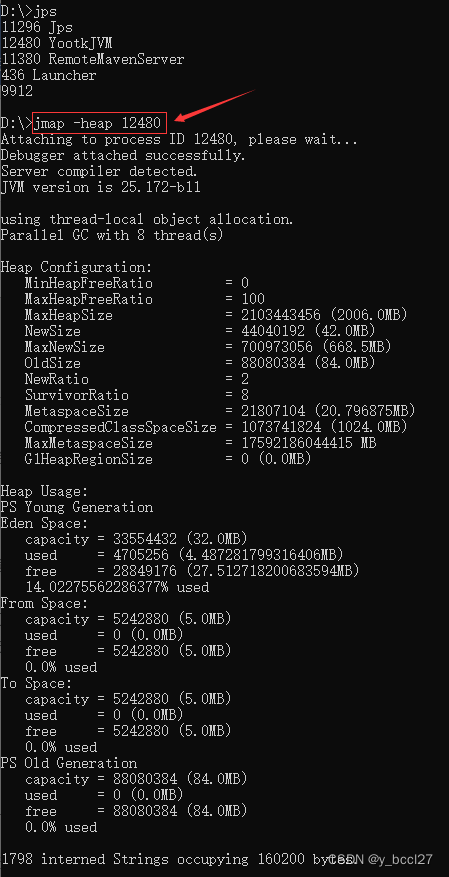 第二步:通过 jmap -heap pid 命令查看堆内存分配情况和使用率