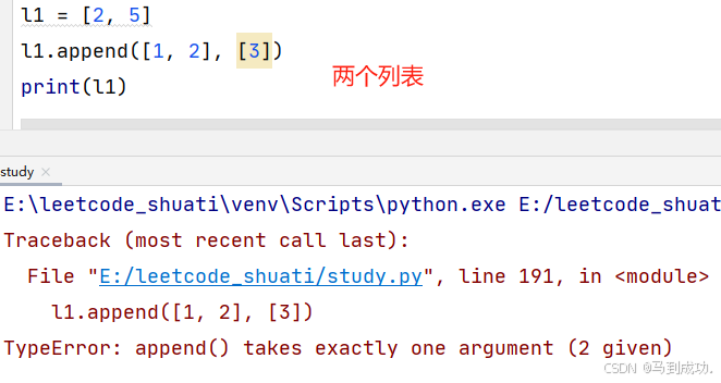 如果加两个元素,就会报错:例如:下面以列表类型为例进行演示,添加两个列表,其它数据类型同理。