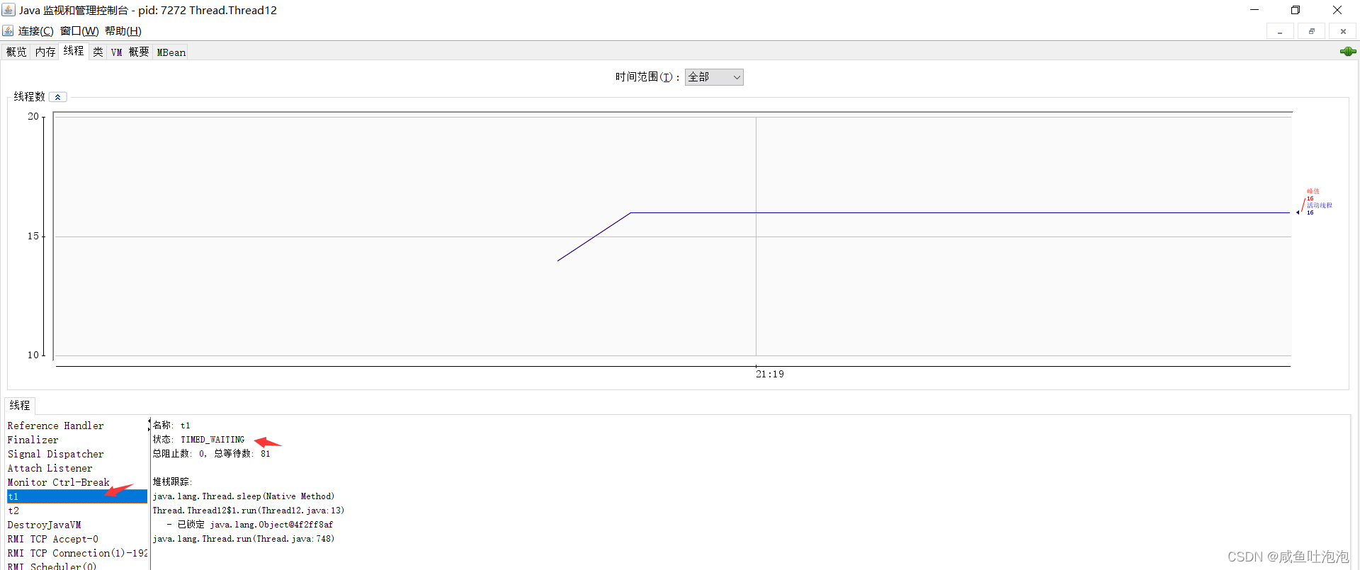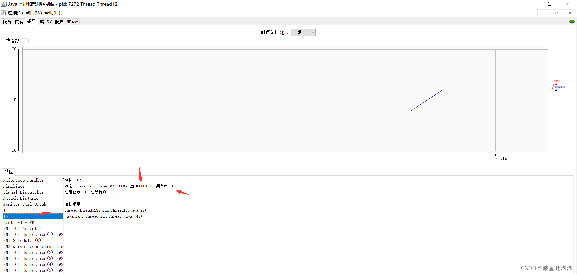 通过jconsole可以发现,线程t1的状态为TIMED_WAITING而t2的状态为BLOCKED。