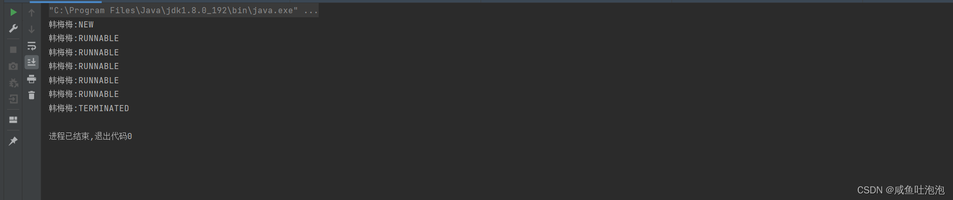 上面的程序在thread线程里面有一个for循环,可以看到再开始运行线程之前线程的状态为NEW,线程运行起来后线程的状态变味了RUNNABLE,最终当线程运行结束以后线程的状态变为TERMINATED 。后面会依次介绍这些状态的基本含义。