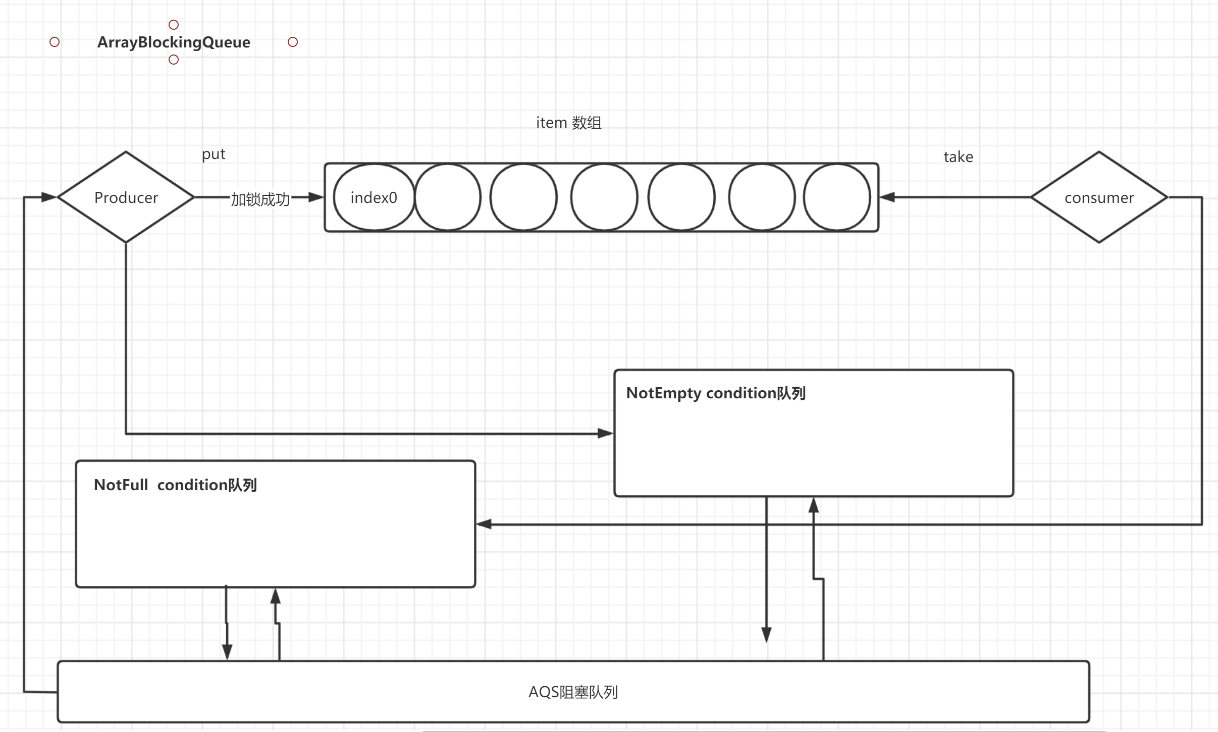 通过维护两个condition条件队列,实现唤醒发送数据队列和获取数据队列。Array是利用数组来存放定长的数据。
