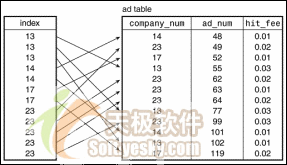 图2是同样的一张数据表,但是增加了对ad表的company_num数据列的索引。这个索引包含了ad表中的每个数据行的条目,但是索引的条目是按照company_num值排序的。现在,我们不是逐行查看以搜寻匹配的数据项,而是使用索引。假设我们查找公司13的所有数据行。我们开始扫描索引并找到了该公司的三个值。接着我们碰到了公司14的索引值,它比我们正在搜寻的值大。索引值是排过序的,因此当我们读取了包含14的索引记录的时候,我们就知道再也不会有更多的匹配记录,可以结束查询操作了。因此使用索引获得的功效是:我们找到了匹配的数据行在哪儿终止,并能够忽略其它的数据行。另一个功效来自使用定位算法查找第一条匹配的条目,而不需要从索引头开始执行线性扫描(例如,二分搜索就比线性扫描要快一些)。通过使用这种方法,我们可以快速地定位第一个匹配的值,节省了大量的搜索时间。数据库使用了多种技术来快速地定位索引值,但是在本文中我们不关心这些技术。重点是它们能够实现,并且索引是个好东西。