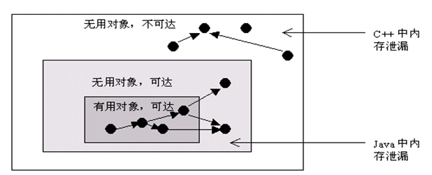 在C++中,内存泄漏的范围更大一些。有些对象被分配了内存空间,然后却不可达,由于C++中没有GC,这些内存将永远收不回来。在Java中,这些不可达的对象都由GC负责回收,因此程序员不需要考虑这部分的内存泄露。