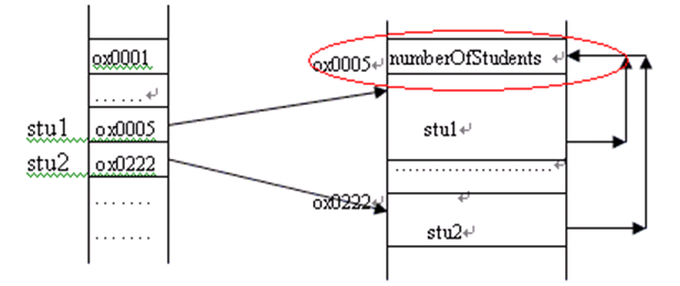 每一次创建一个新的Student实例时,成员numberOfStudents都会不断的递增,并且所有的Student实例都访问同一个 numberOfStudents变量,实际上int numberOfStudents变量在内存中只存储在一个位置上。