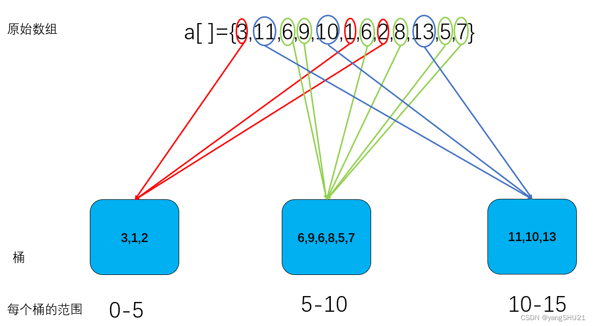 桶排序就是依据某种方法,或者某种规则先划分出若干个桶,然后根据一定的规则把数据放到相应的桶内,再让桶内的元素排序(一般每个桶内的元素数量有限,因此可以选取各种排序方法),最后再把所有桶的元素合并